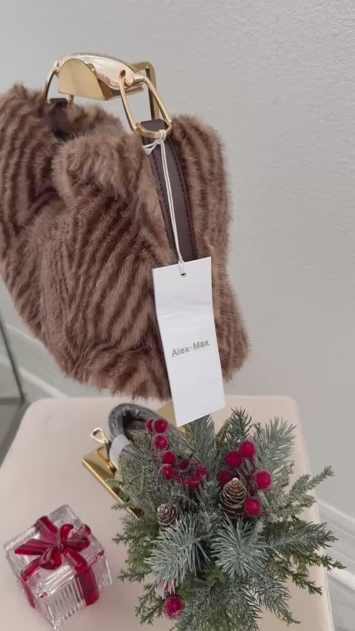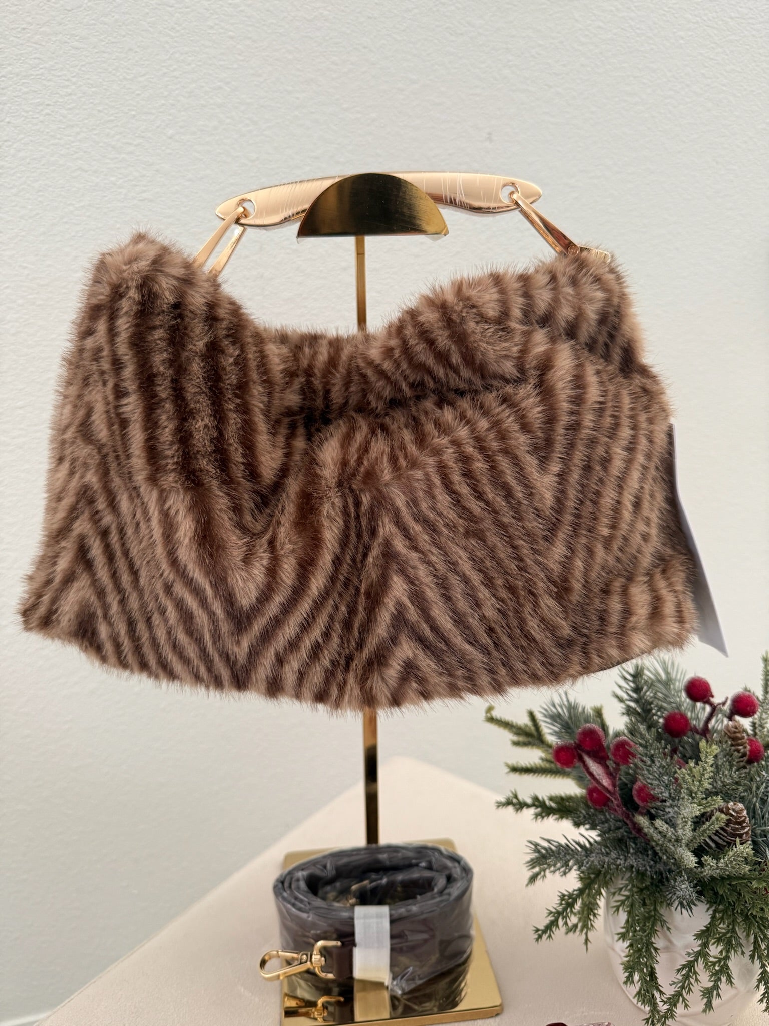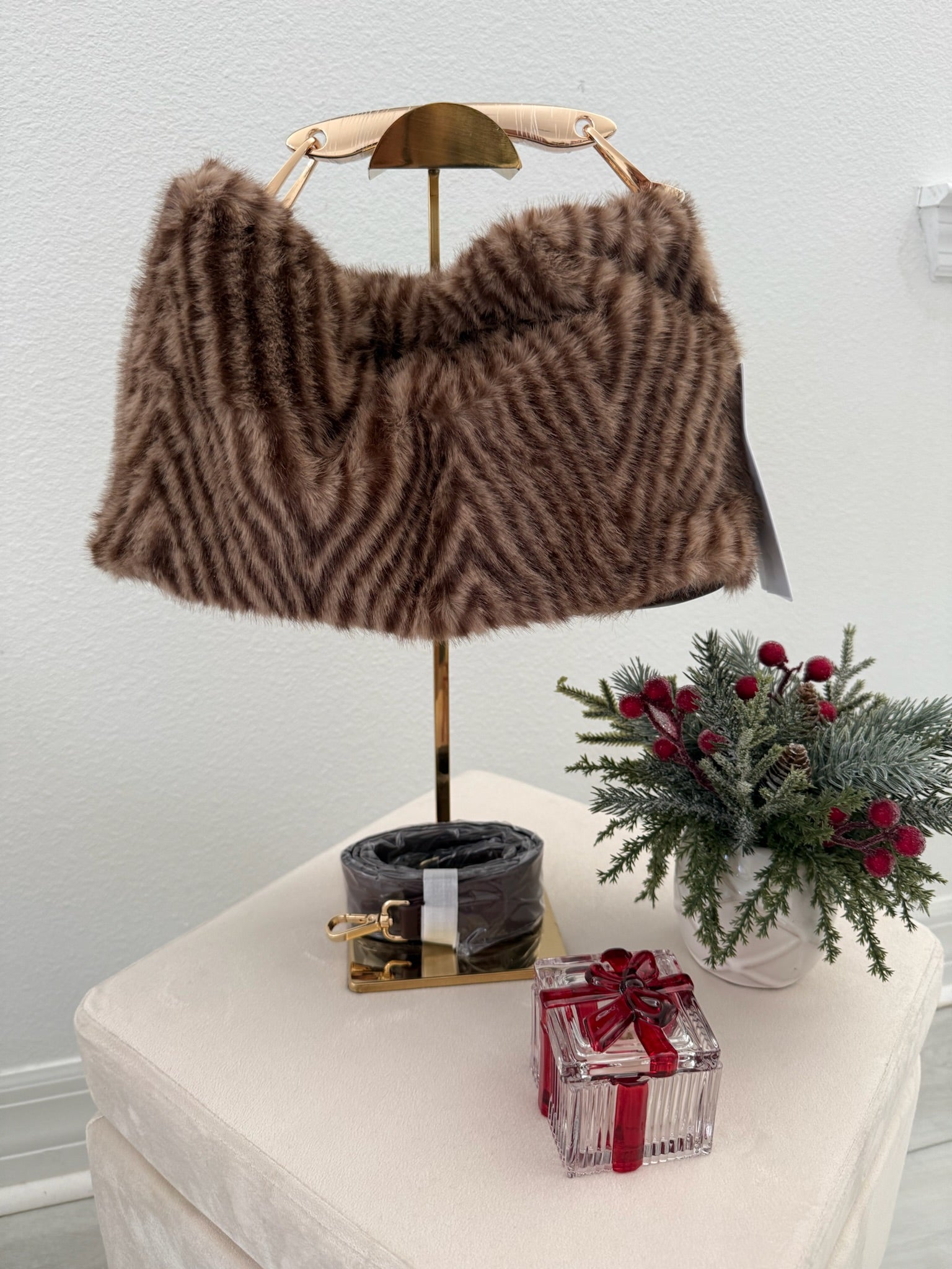 Elevate your winter style with this luxe faux-fur shoulder bag, featuring a rich brown chevron pattern and a sleek gold-tone handle. Soft to the touch yet structured in shape, it includes a detachable strap for versatile wear. Perfect for adding a cozy, chic finish to any cold-season look.